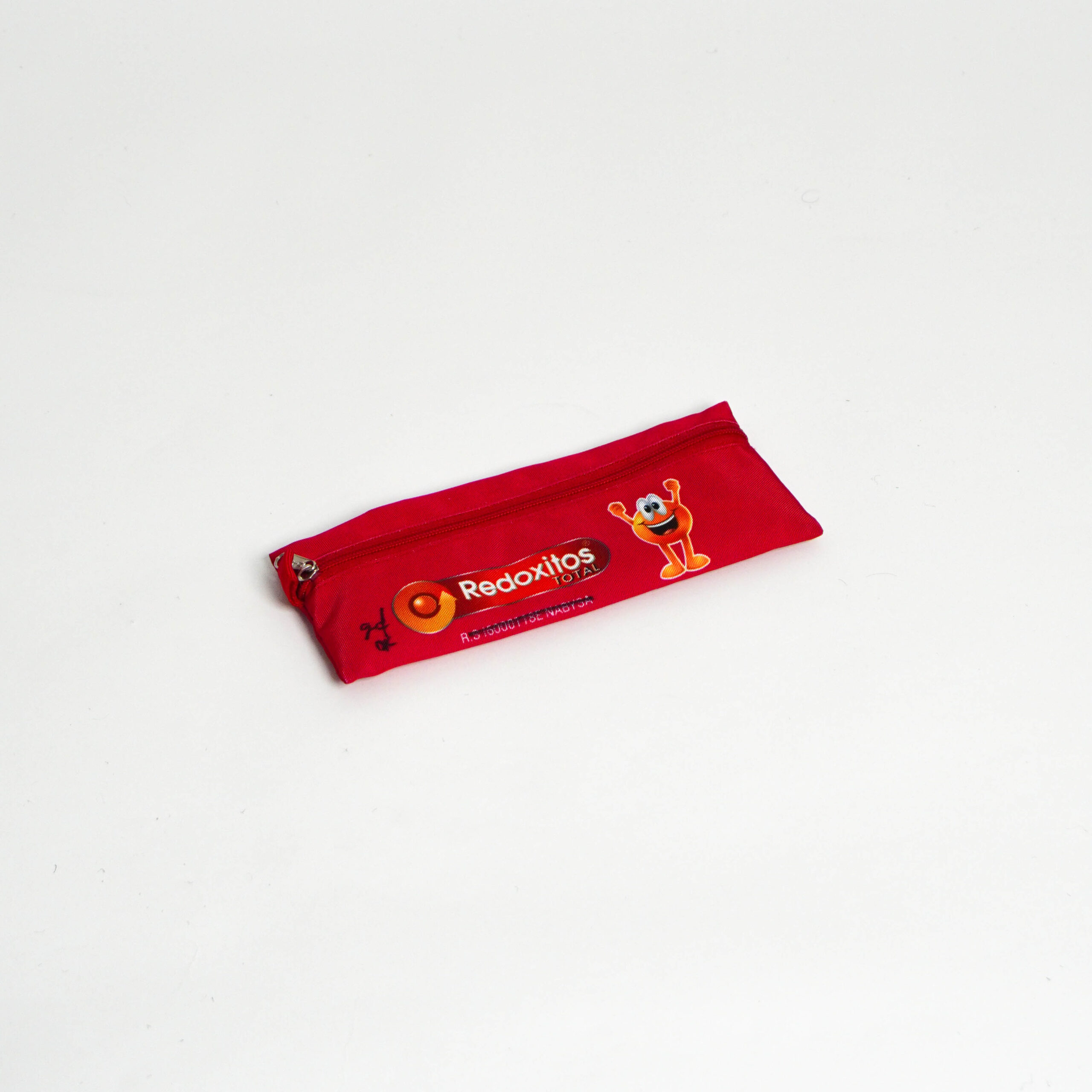 01 cartuchera color rojo con logo Redoxitos conteniendo 06 colores, 01 lápiz y 01 borrador.