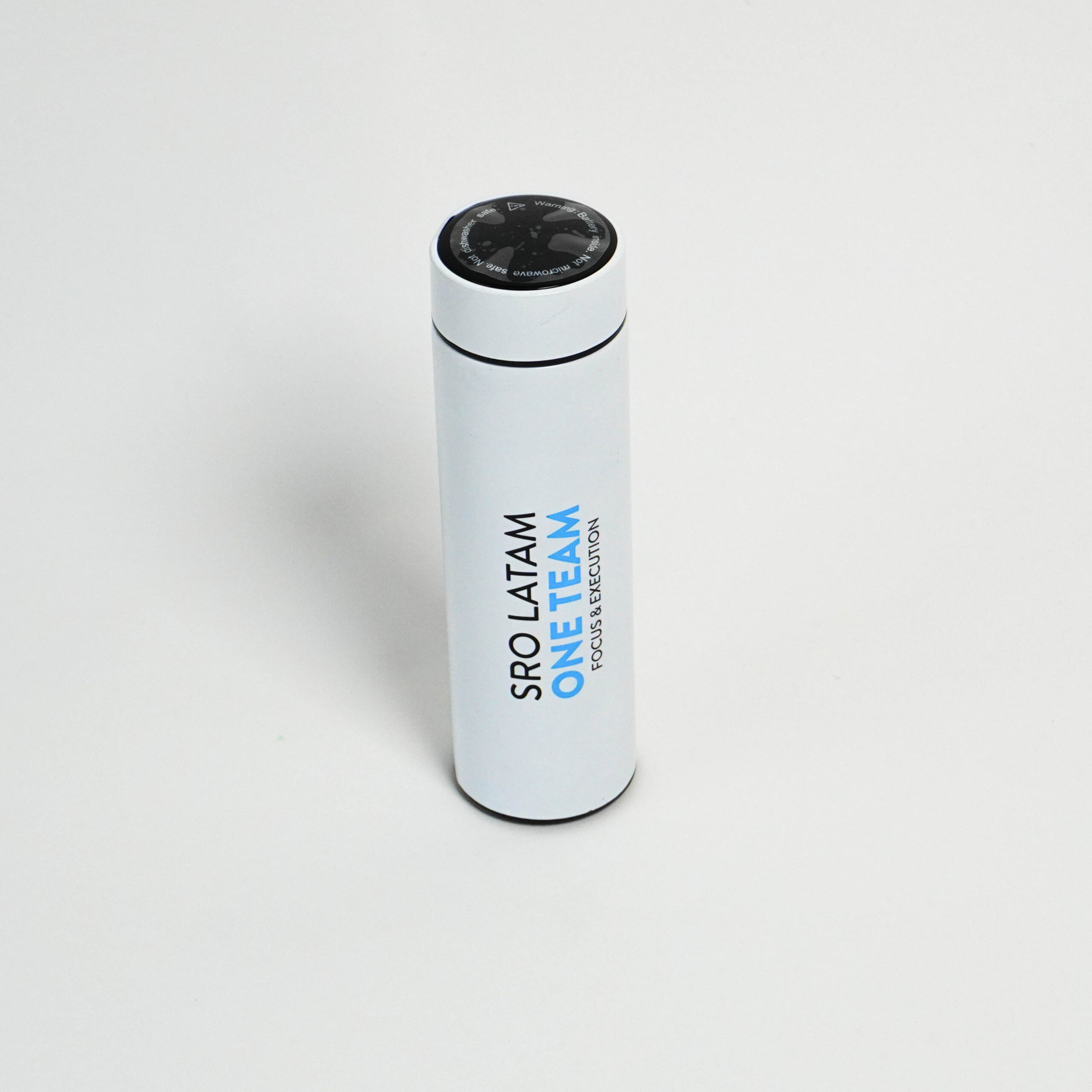 - 01 termo metálico color blanco con indicador de temperatura y logo Abbott color turquesa.