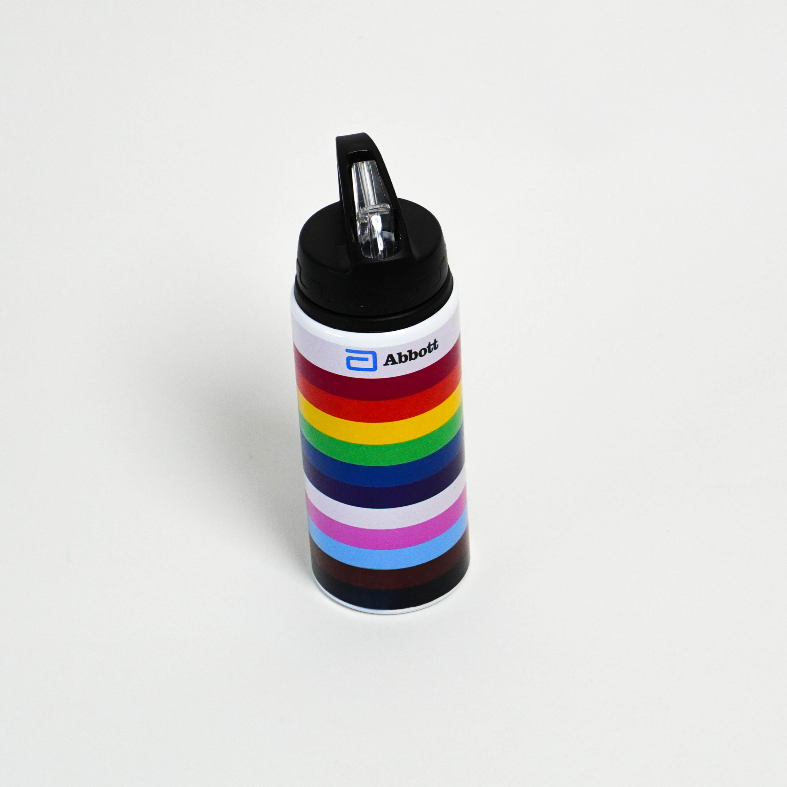 - 01 tomatodo metálico con tapa plástica con cañita integrada color blanco y logo Abbott en color negro.