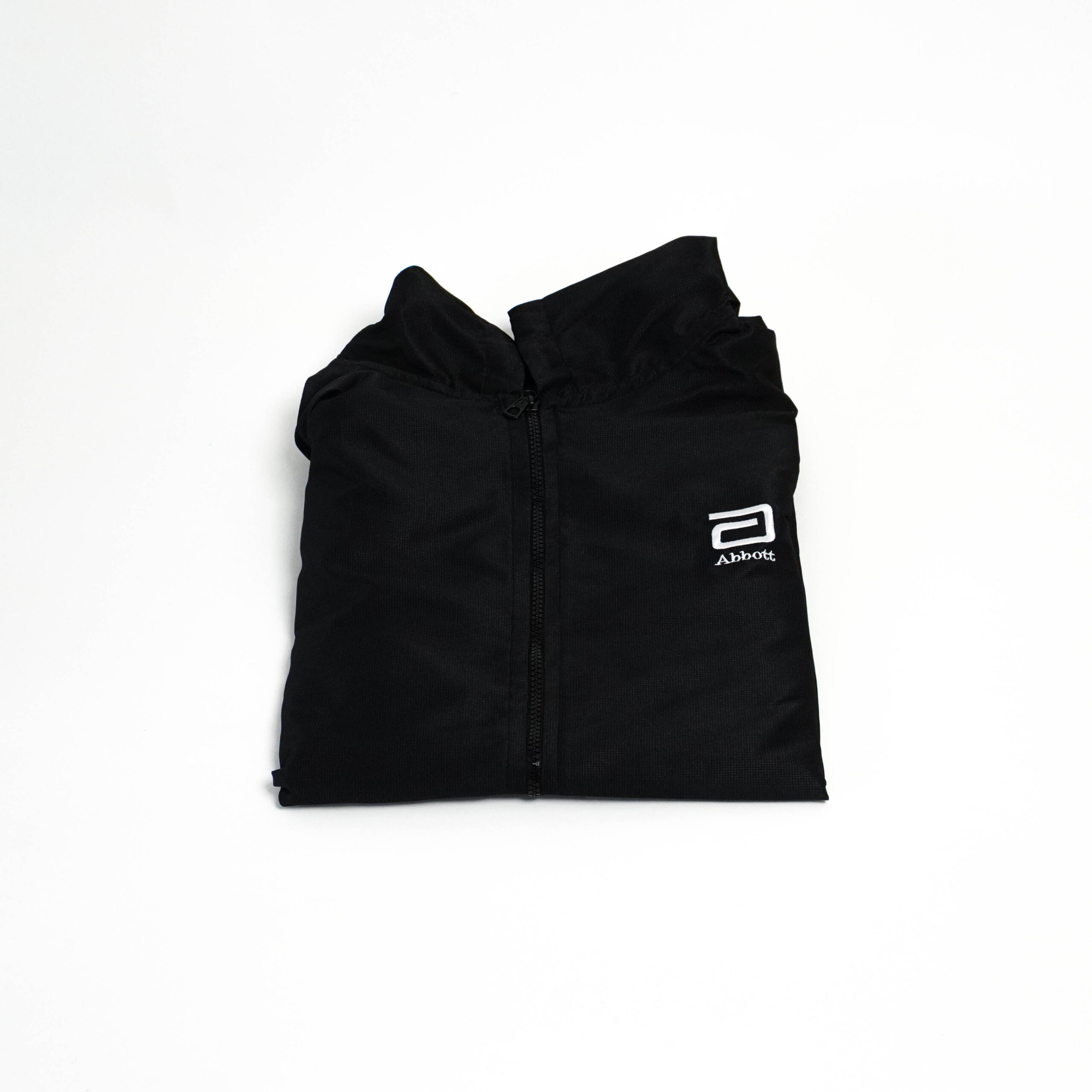 - 01 casaca color negro en tela waffer o taslan coquitos modelo convertible a neceser con logo Abbott en color blanco.