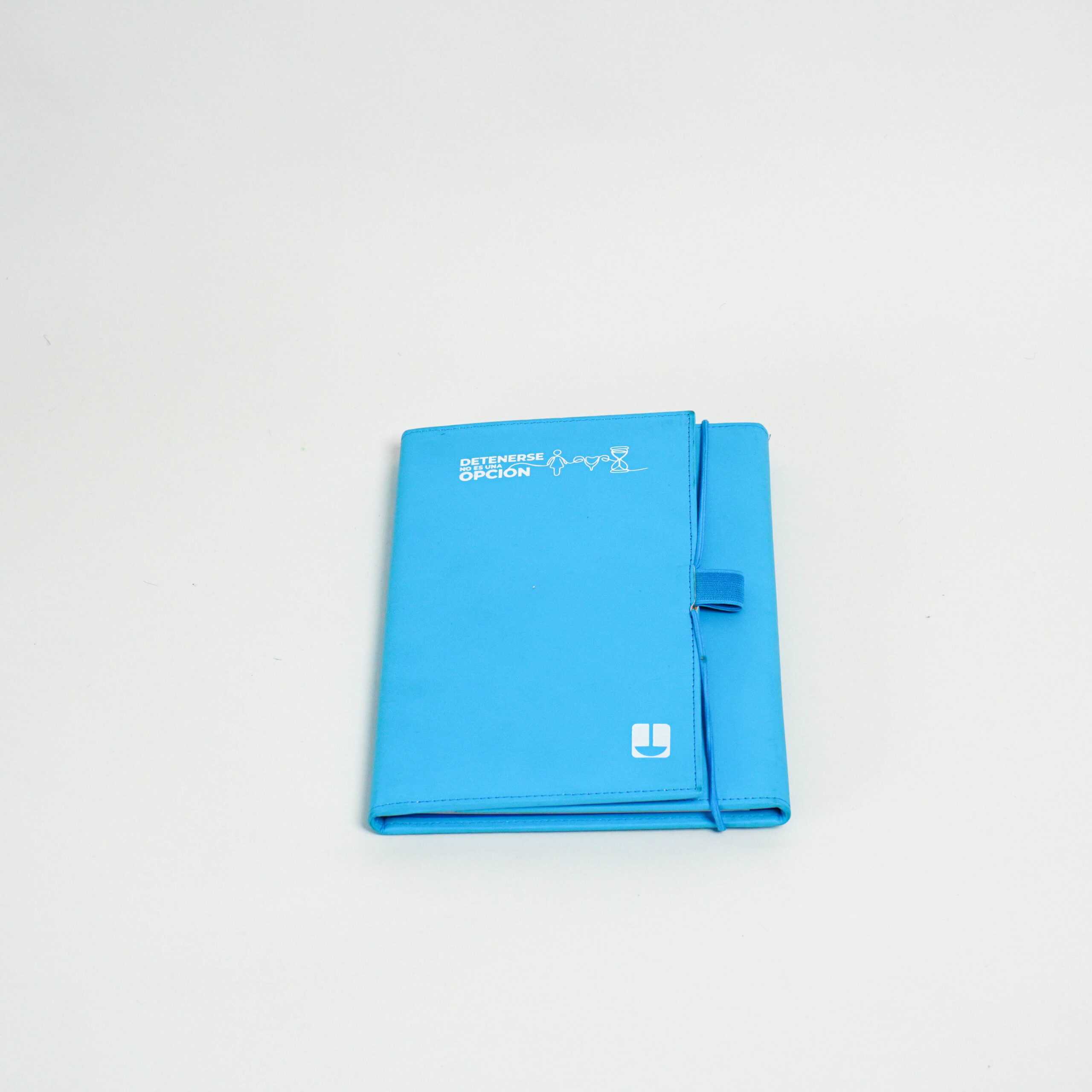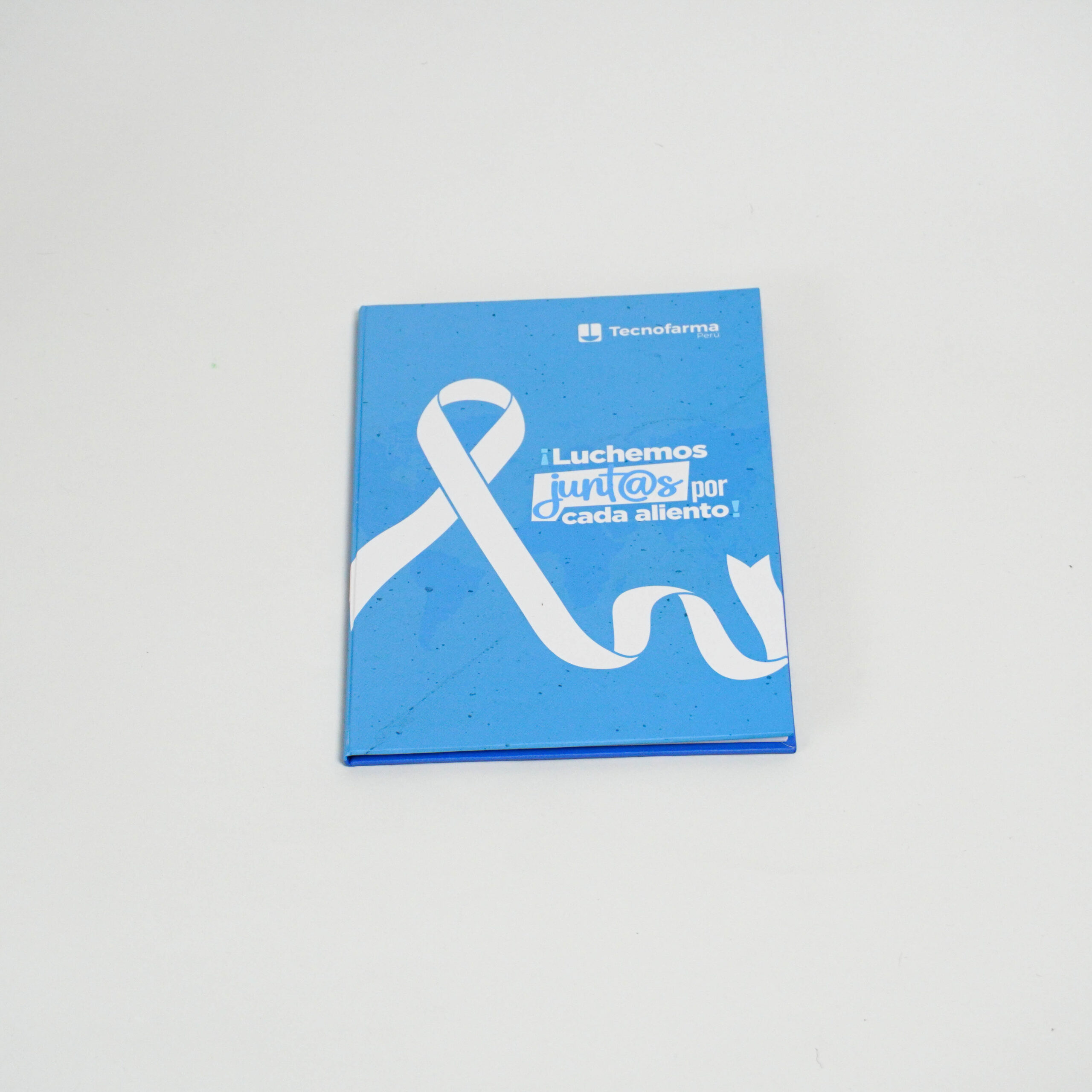 - 01 cuaderno delgado tamaño A5 empastado color celeste logo “¡Luchemos juntos por cada aliento! – Tecnofarma.