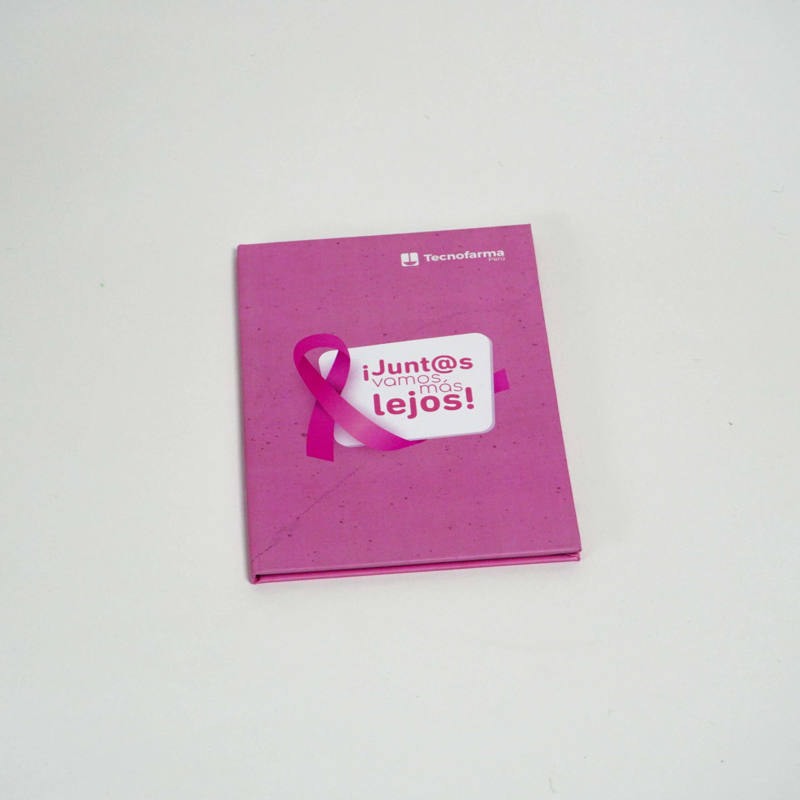 - 01 cuaderno delgado tamaño A5 empastado color rosado logo “¡Juntos vamos más lejos! – Tecnofarma.